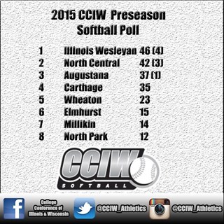 NAPERVILLE, Ill. – Illinois Wesleyan was picked to defend its College Conference of Illinois & Wisconsin (CCIW) softball title in 2015 according to a preseason coaches’ poll conducted Wednesday.